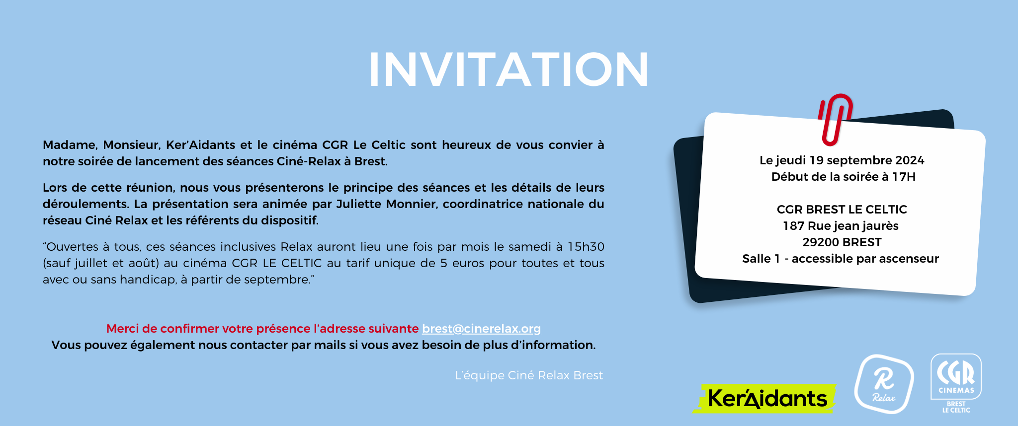 Merci de confirmer votre présence à la réunion de présentation à l’adresse suivante brest@cinerelax.org. N’hésitez pas à relayer cette invitation auprès de vos réseaux ainsi que la recherche de bénévolat associé à ce projet.