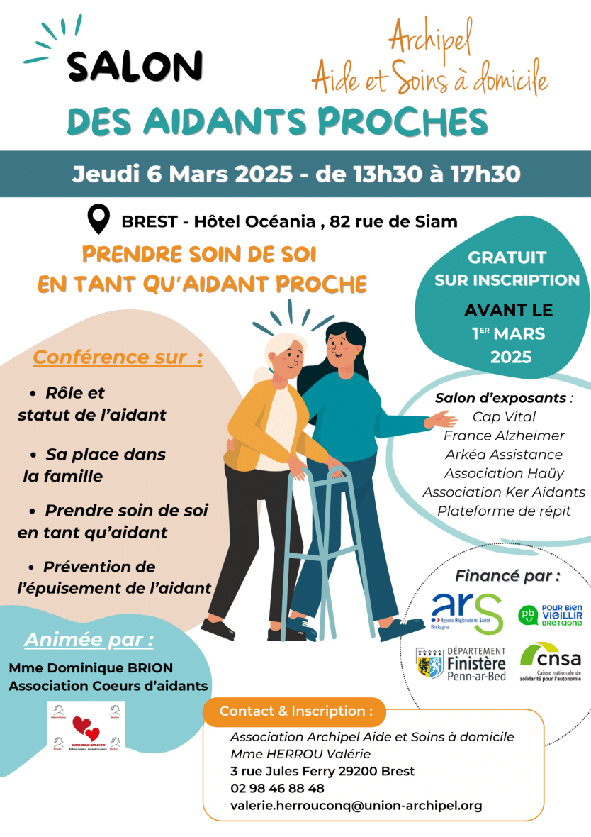 L’Association Archipel Aide et Soins à Domicile, avec le soutien du Département du Finistère, vous propose de venir en discuter en participant à notre salon, le jeudi 6 mars de 13h30 à 17h30.