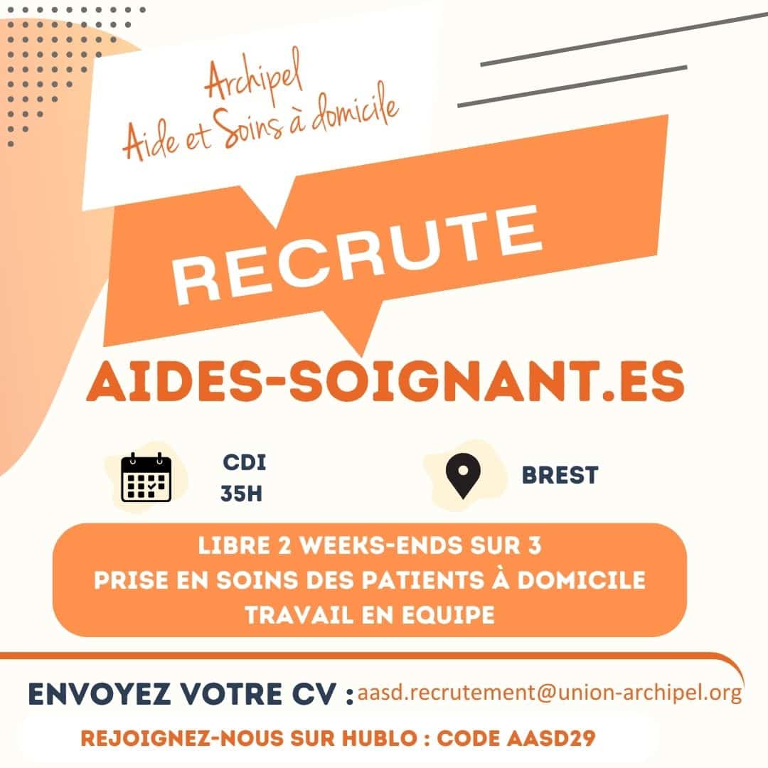 Le Pôle Autonomie de l’association Archipel Aide et Soins A Domicile recrute des aides-soignants.es pour le SSIAD, Brest.