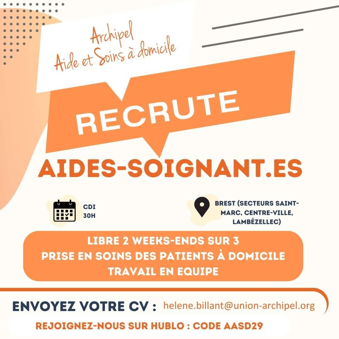Le Pôle Autonomie de l’association Archipel Aide et Soins A Domicile recrute des aides-soignants.es pour le SSIAD, Brest.
