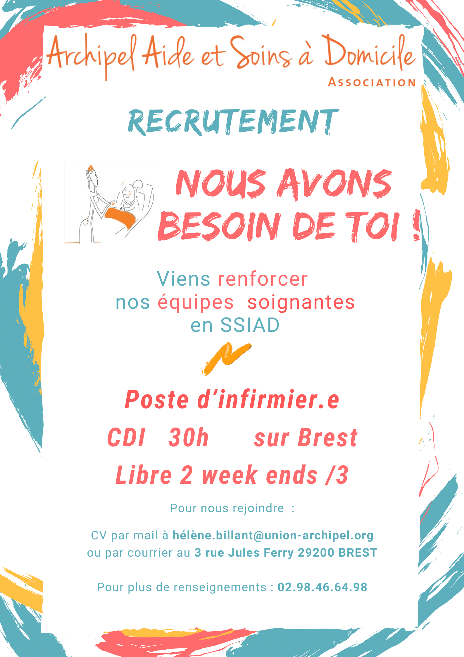 Vous pouvez envoyer vos CV et lettres de motivation au 3 rue Jules Ferry à Brest ou les envoyer par mail à : aasd.recrutement@union-archipel.org