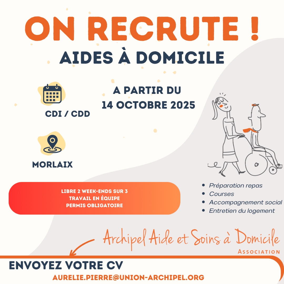📢📢L’Association Archipel Aide et Soins à Domicile, recrute en CDI des aides à domicile sur le secteur de Morlaix📌