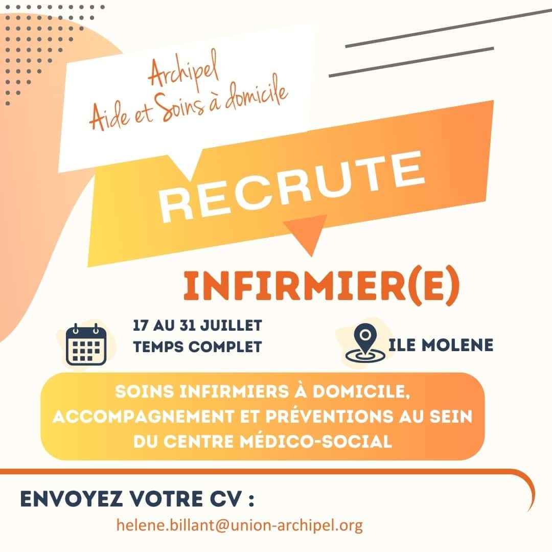 📌 L’Association Archipel Aide et Soins à Domicile, recrute un(e) Infirmier.e en CDD, temps complet du 17 au 31 juillet 2024 pour le Centre médico-social de l’Ile de Molène.